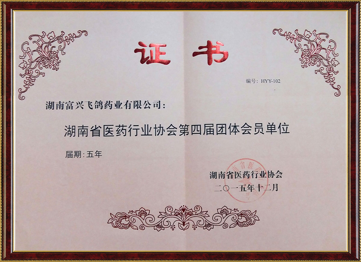湖南省醫藥行業協會第四屆團體會員單位證書